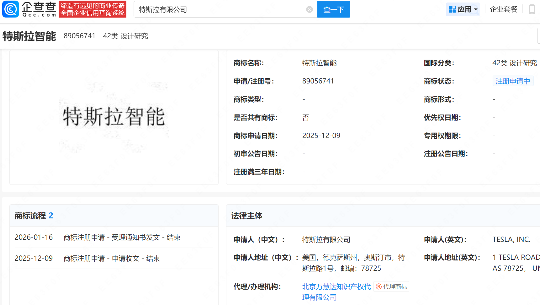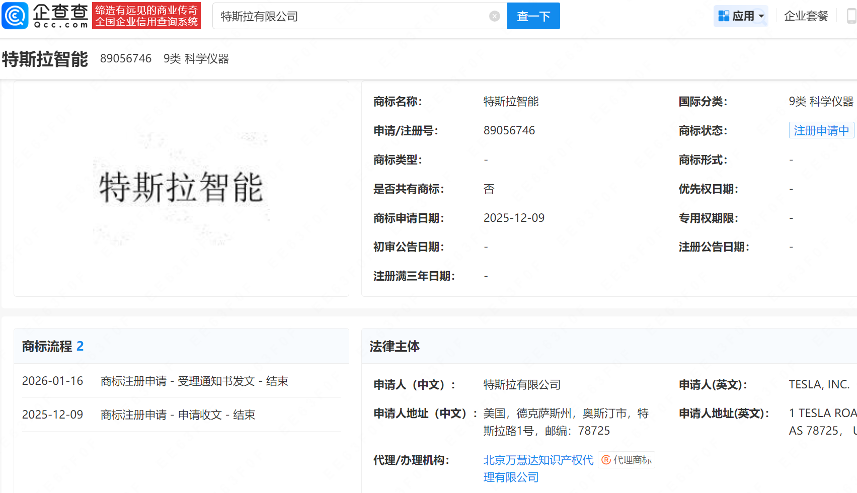 近日,特斯拉有限公司申请注册两枚“特斯拉智能”商标,国际分类为科学仪器、设计研究,当前商标状态均为注册申请中。
