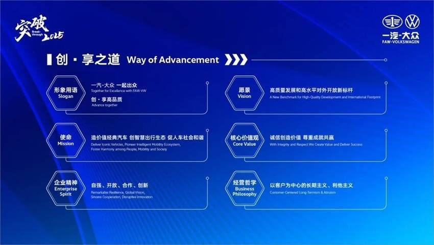 突破2025,面对瞬息万变的产业形势与日趋激烈的市场竞争,一汽-大众党群体系深刻把握新形势新任务新要求,贯彻集团公司党委“1156”工作部署,以“融·领”党建品牌为统领,坚决落实公司党委各项要求,深入推进党建经营融合,抓紧抓实“七个强化”重点工作,以高质量党建引领保障公司“五大突破”取得实效,助力实现年度经营目标。