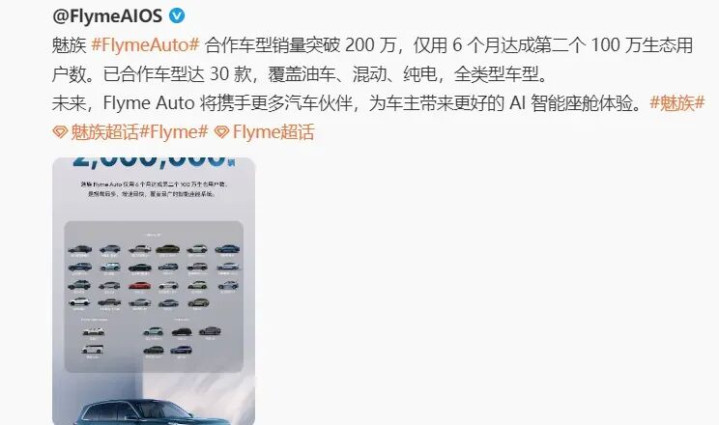 官方海报显示,魅族 Flyme Auto 合作车型累计销量突破 191.3 万辆,距离 200 万辆仅有一步之遥。按照目前的增长速度,最快这个月便能达成这一里程碑时刻。