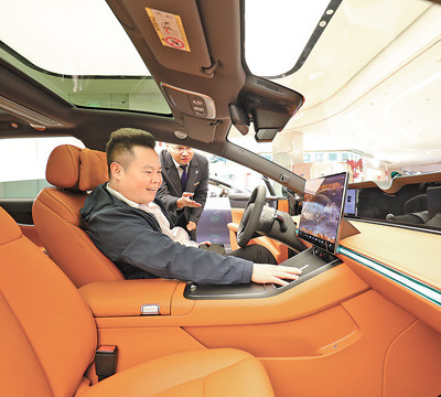 重庆市沙坪坝区三峡广场,市民在试驾新能源汽车。