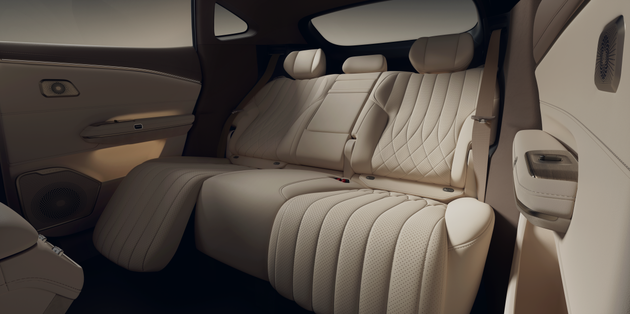 舒适配置也是一步到位:143度后排电调天王椅、全车大面积软包、22扬声器音响、智能新风系统、四门无框电吸门、五块双层夹胶静音玻璃、后排隐私玻璃、后排小桌板、2.34平方米全景天幕、电动遮阳帘、第三代热泵系统……统统标配。